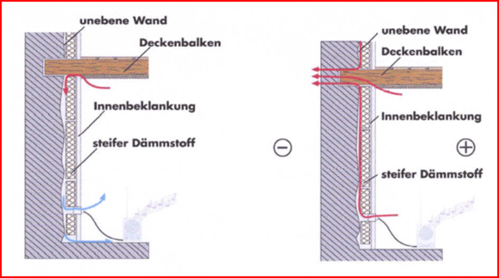 - Vznik kondenzátu vlivem proudění vzduchu mezi studenou a teplou stranou vnitřního zateplení představuje pro stavební fyziky důležitější problém než difuze. Kvantitativní stránka tohoto problému není ještě dostatečně vědecky objasněna. Nutno dodržet zásadu celoplošného přilepení izolantu na podklad nebo přilepení, které zabraňuje proudění vzduchu pod izolantem